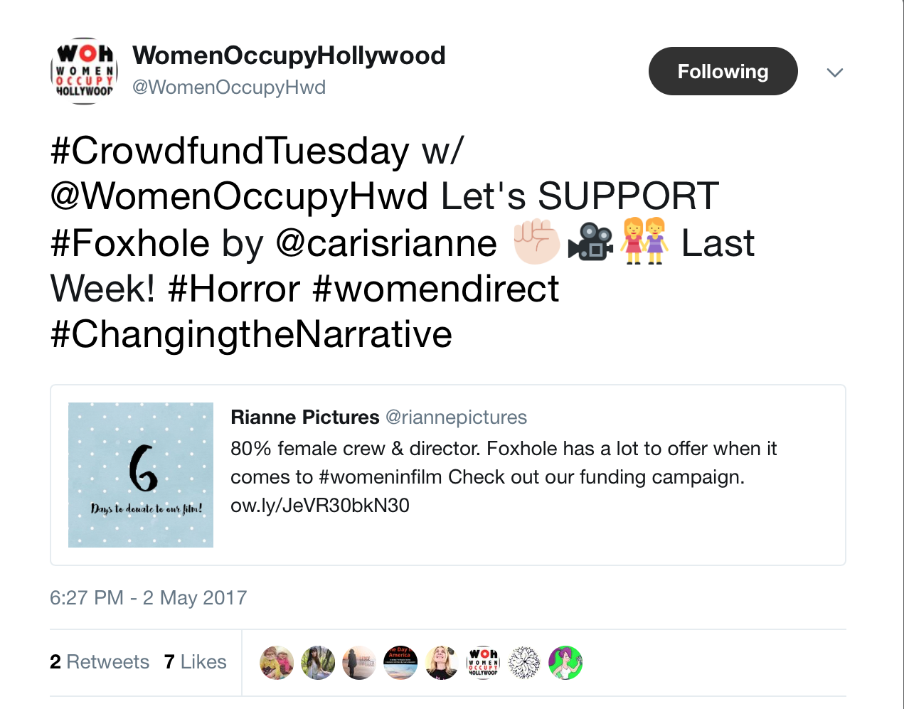 People may not always be able to donate, but a simple re-tweet or a share on Facebook of your campaign link and your page could be seen by other people who can! We formed a connection with the Twitter page WomenOccupyHollywood who kindly promoted our page every Tuesday as part of their Crowdfund Tuesday campaign, this opened up our campaign to an American audience and landed us a place on the Most Popular Campaigns in New York List....along with some large donations.