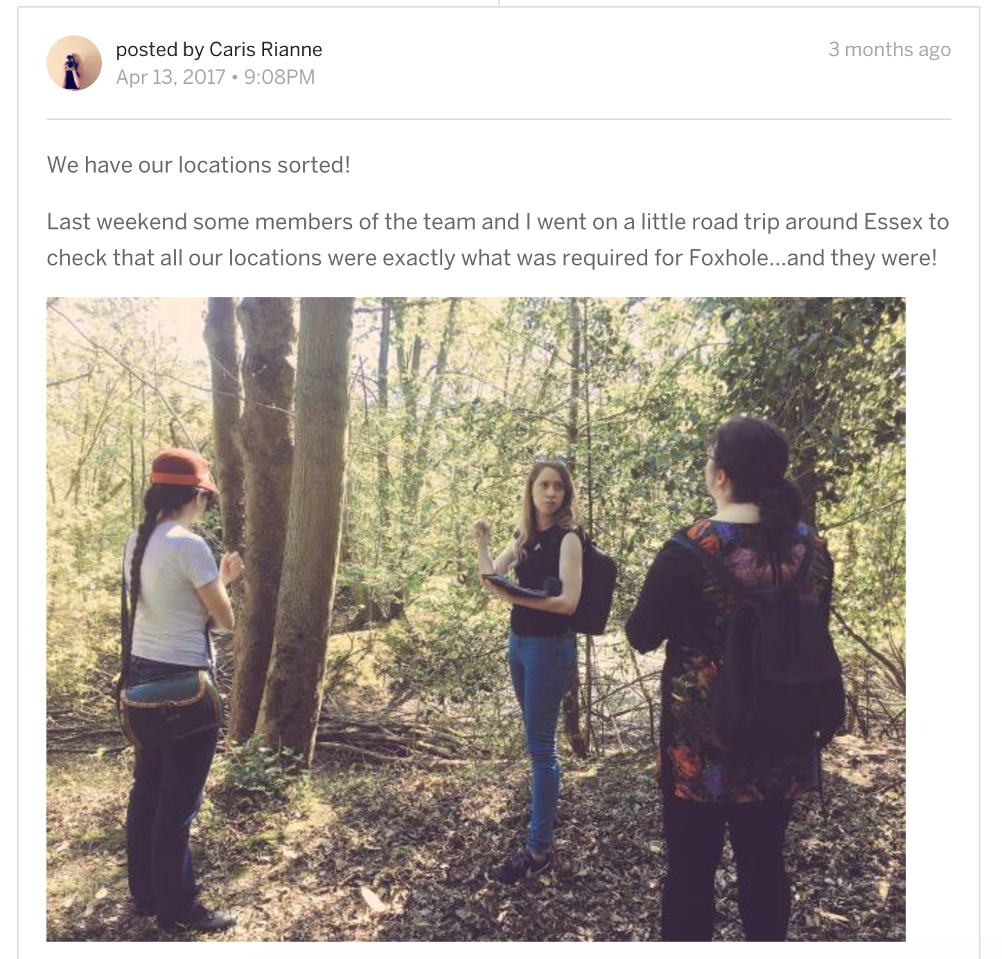 So say it with pictures! When we held our rehearsal day for Foxhole we ensured that we took plenty of pictures for our campaign page, people want to see that the project is realistic. You can also post photographs of concept ideas you may have for locations, costumes, props! Even films that you feel have influenced your project.